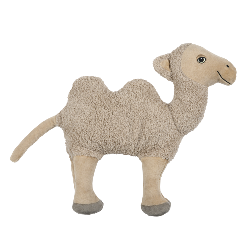 Dieses Kamel schließt jeder sofort ins Herz. Das kontaktfreudige Trampeltier lebt gern in einer Familie und pustet einem freundlich zur Begrüßung ins Gesicht. Mit einem Zwinkern erzählt es gerne mal einen Scherz und lässt sich durch nichts aus der Ruhe bringen. Dank seiner flachen Form kann man es sich ganz praktisch auf den Bauch legen und so jeden Feierabend genießen. Es ist etwa 35 cm lang, 34 cm hoch und 6 cm tief. Das Kamel wiegt etwa 750 g.